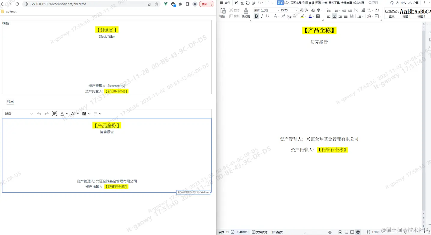 以富文本的形式,实现文本+表格内容的展示,部分内容以变量的形式动态获取,并支持导出为word文档
