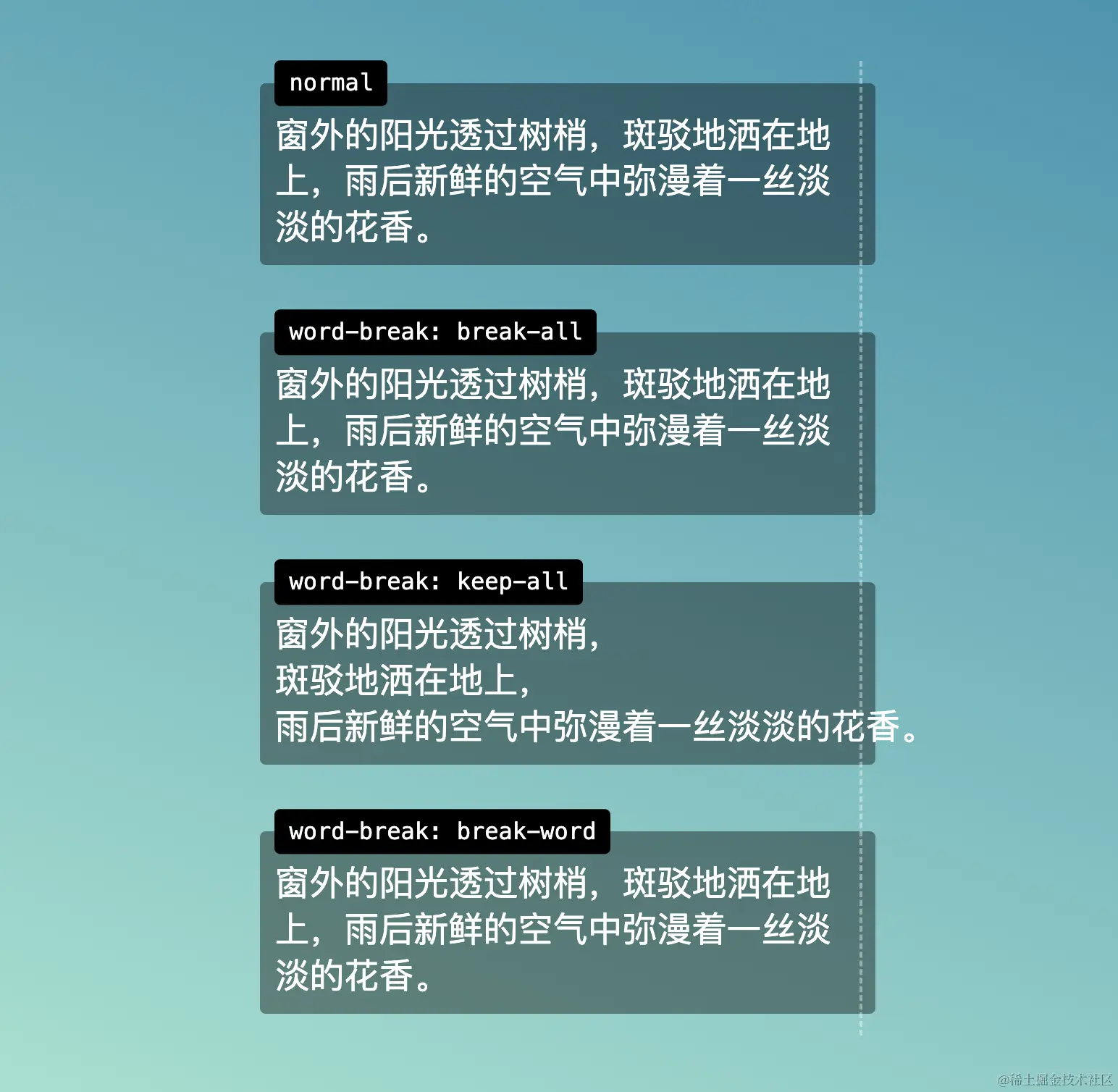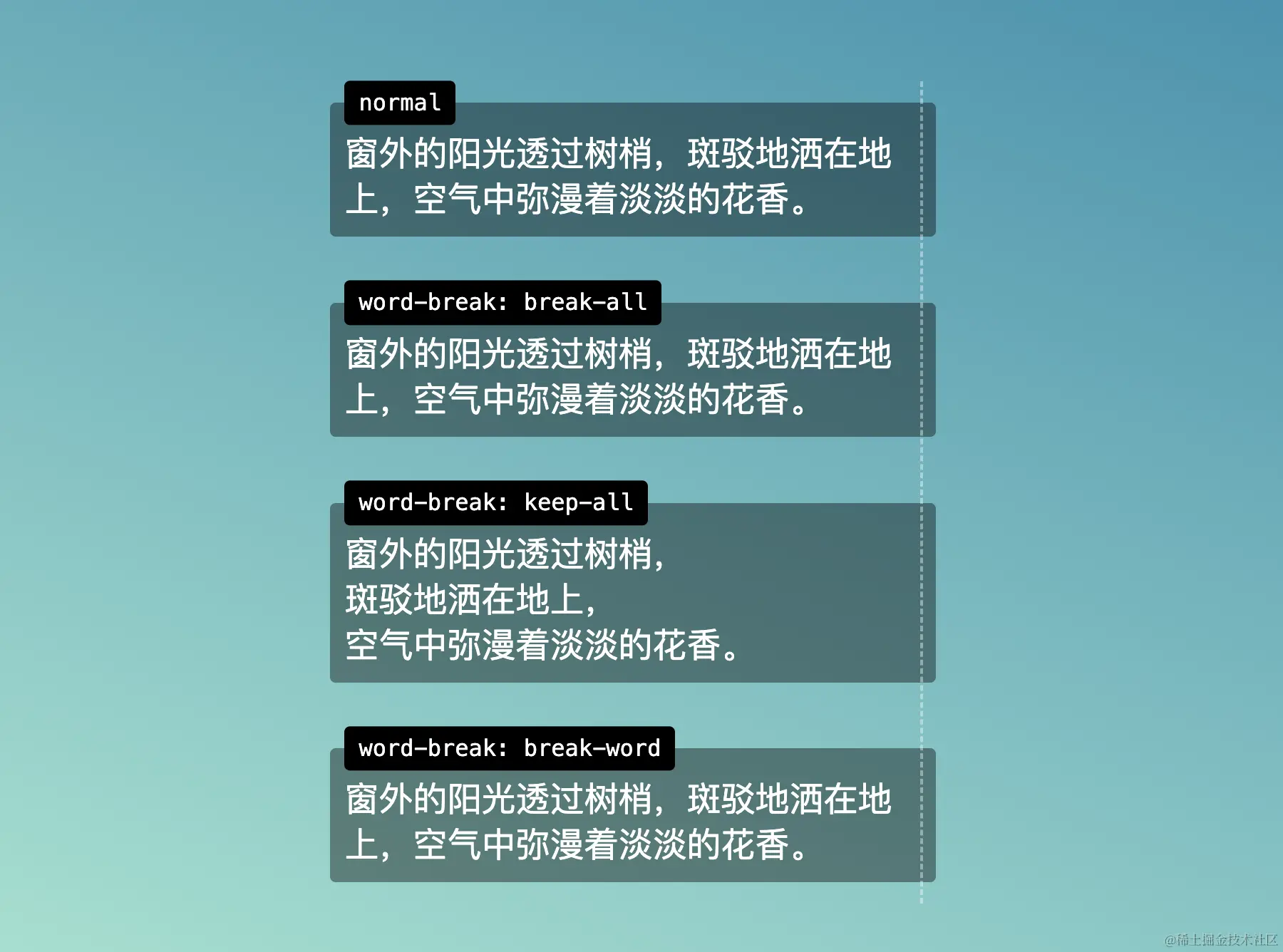 最后再强调一下 word-break 属性和 overflow-wrap 属性的主要区别: