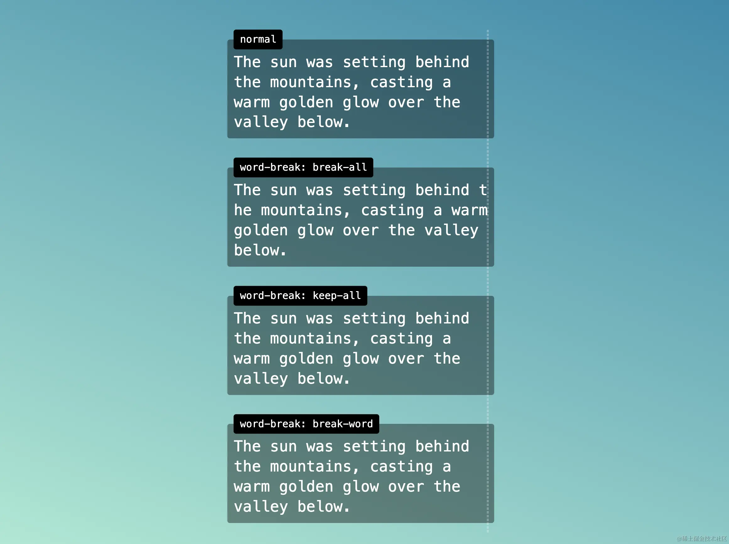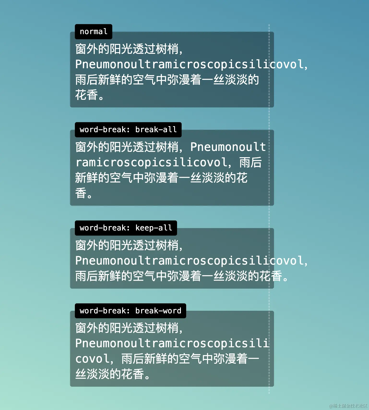 可以看到,设置了 break-all 属性的段落,只要单词碰到容器边界,就立即换行,根本不关心单词是否被拆成两半,会造成一定的阅读困难。对于一般的文本段落,是非常不推荐设置成 break-all 属性的,但是有很多同学用它来解决下面的文本溢出问题: