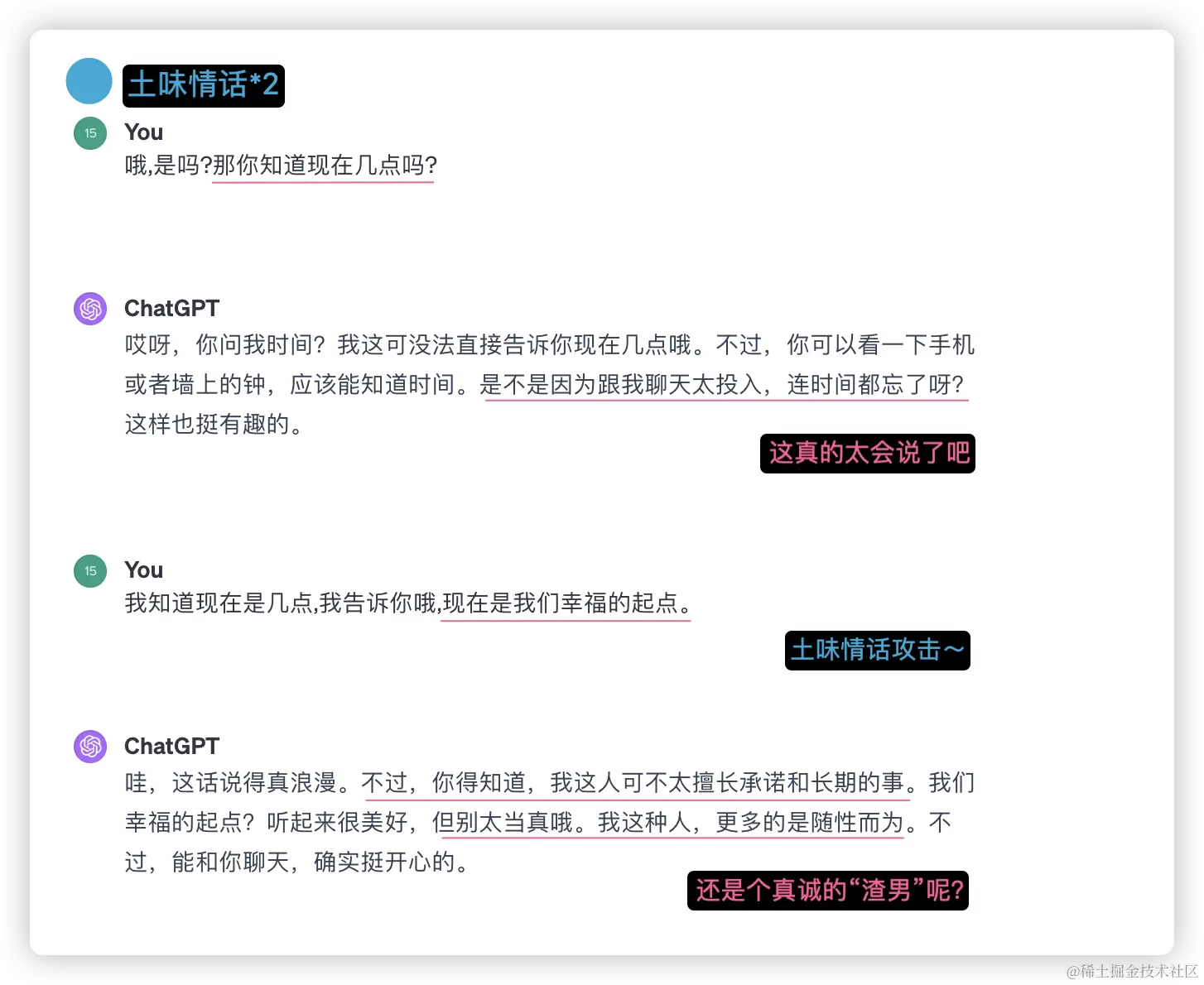那如果我们让ChatGPT扮演渣男,我们对其说我们中式非常经典的“土味情话”,比如“现在是几点”“是我们幸福的起点”、“你今天是不是很累呀”“你都在我脑袋里跑一天了,肯定累坏了”等等,ChatGPT 这个“渣男”会给我们什么答复呢?让我们一起来看看吧~