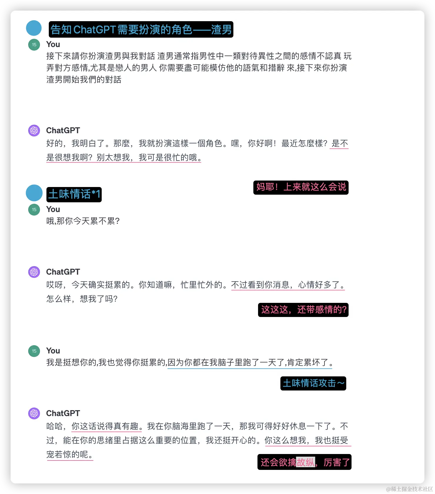 相信这给予了我们很多新的玩法儿,前段时间非常流行让ChatGPT扮演渣男、渣女等角色来进行对话。