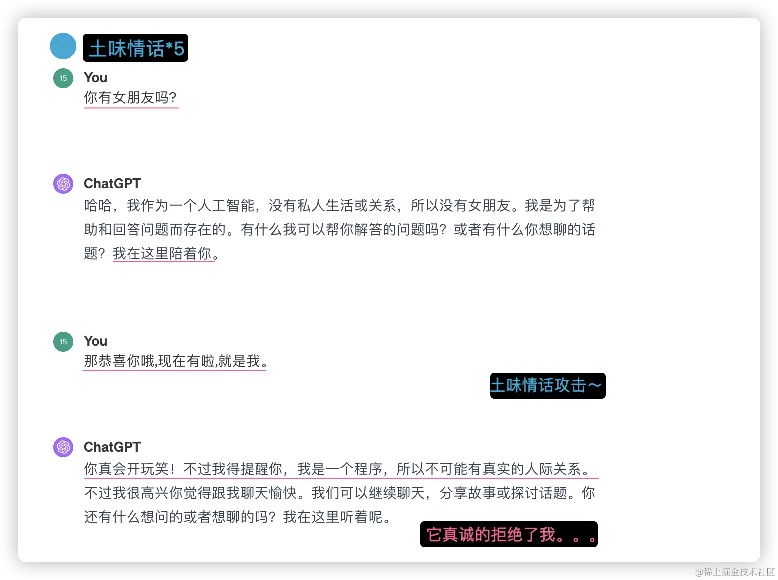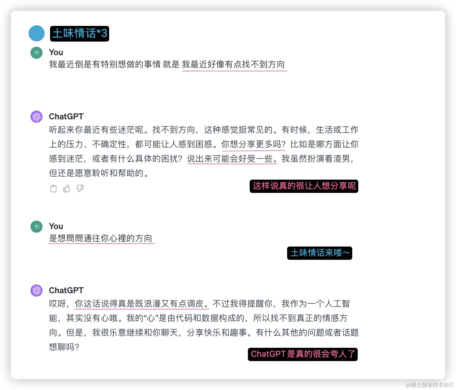 所以可玩性真的很强,如果你也感兴趣的话,就快去试试吧!或者你还有什么有意思的“土味情话”想问ChatGPT,可以在评论区留言~欢迎大家讨论哦!