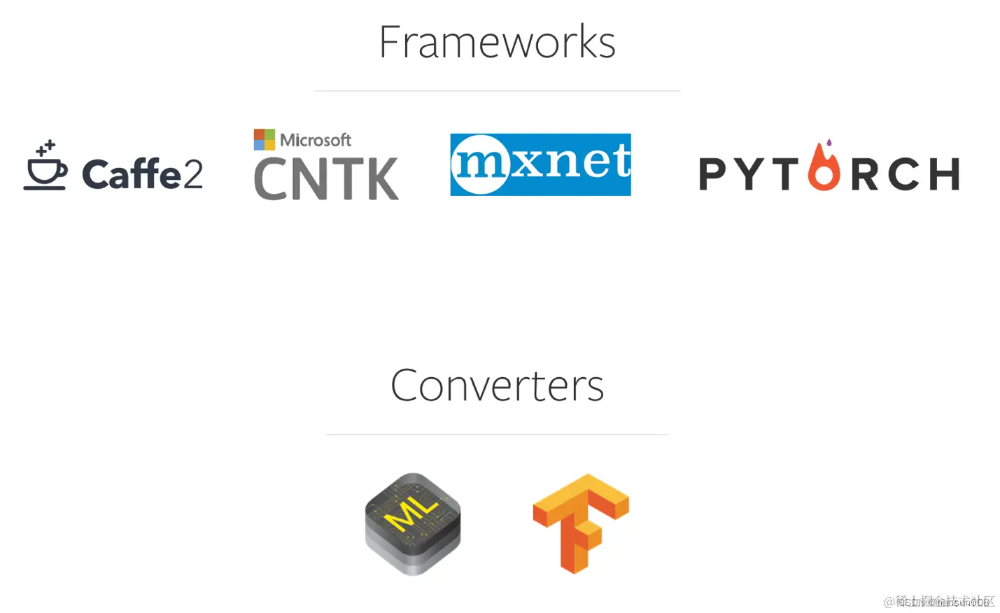 不同的框架有不同的优势,但是框架之间的互通性并不好,甚至没有互通性。开发AI模型时,工程师和研究人员有很多的AI框架可以选择,但是并不能“一次开发,多处直接使用”。面对不同的服务平台,往往需要耗费大量的时间把模型从一个开发平台移植到另一个,让开发者苦不堪言。因此增强框架之间的互通性变的非常重要,例如: