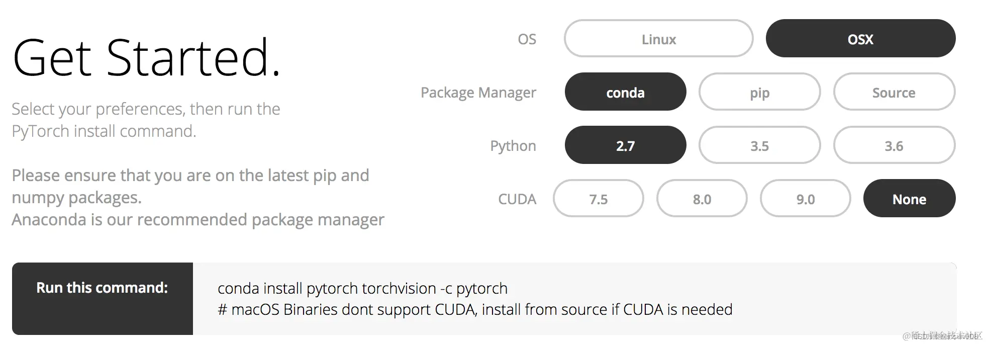 PyTorch已经更新了官网版本,已经支持了ONNX,因此你可以直接使用官网的方式安装了。 【注意:如果本地已经安装过了,使用此方法安装后,需要重新安装 TorchVision ( conda install torchvision -c pytorch ),否则部分功能可能不能使用。】