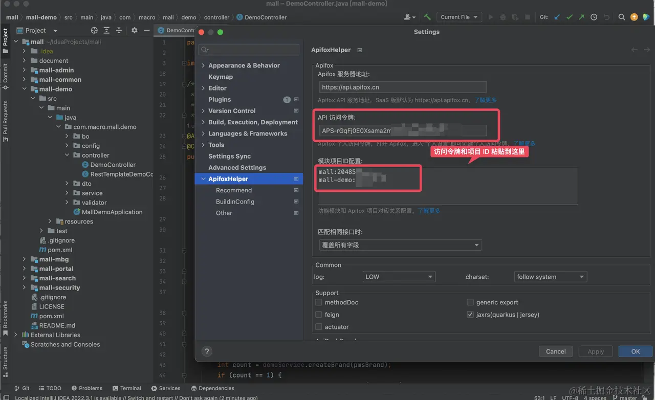 在 IDEA 中,点击 File-->Settings -->Other Settings,找到 Apifox Helper。 将刚才复制的访问令牌和项目 ID 粘贴到这里:
