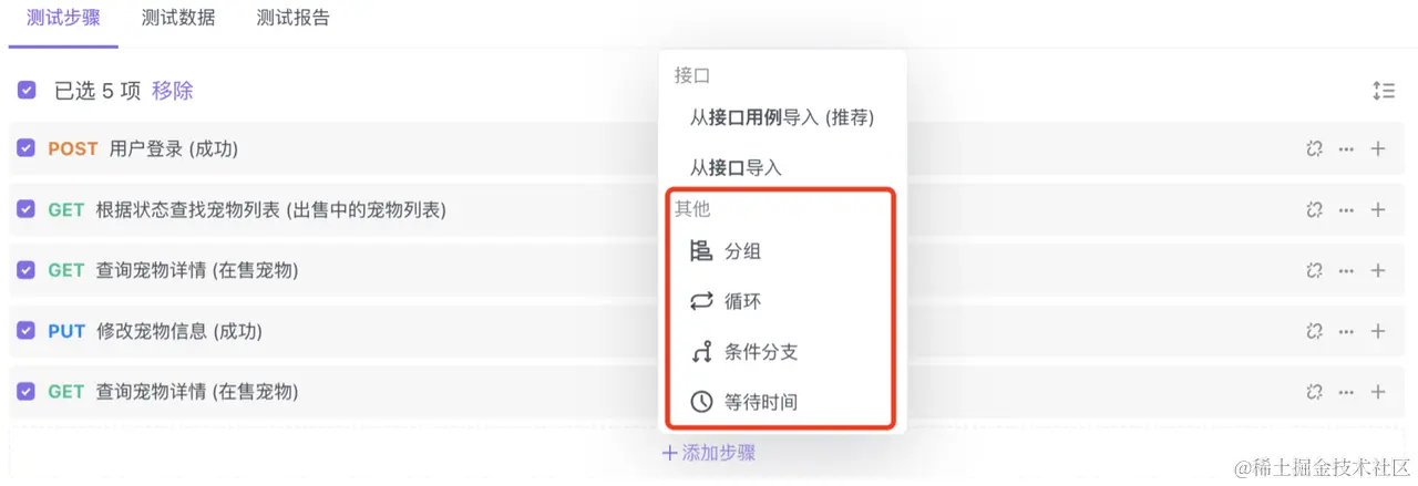 对测试步骤进行编排,模拟业务情景设置测试流程控制条件(循环、判断、等待):
