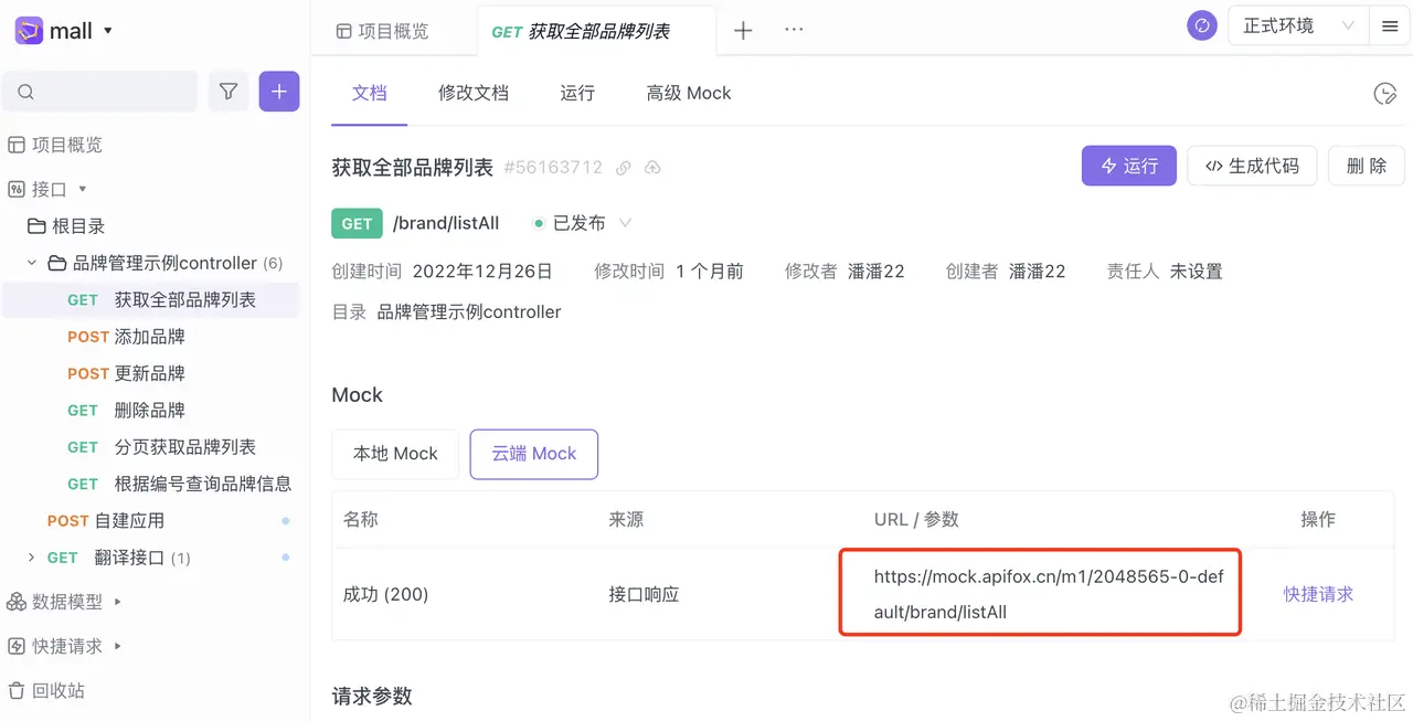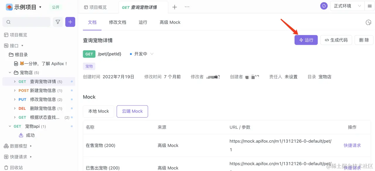 当你通过插件同步了文档到 Apifox 项目里后,前端同学直接在文档内就可以一键点击「运行」调试,不需要再复制粘贴、也不需要和后端开发反复核对参数等信息。