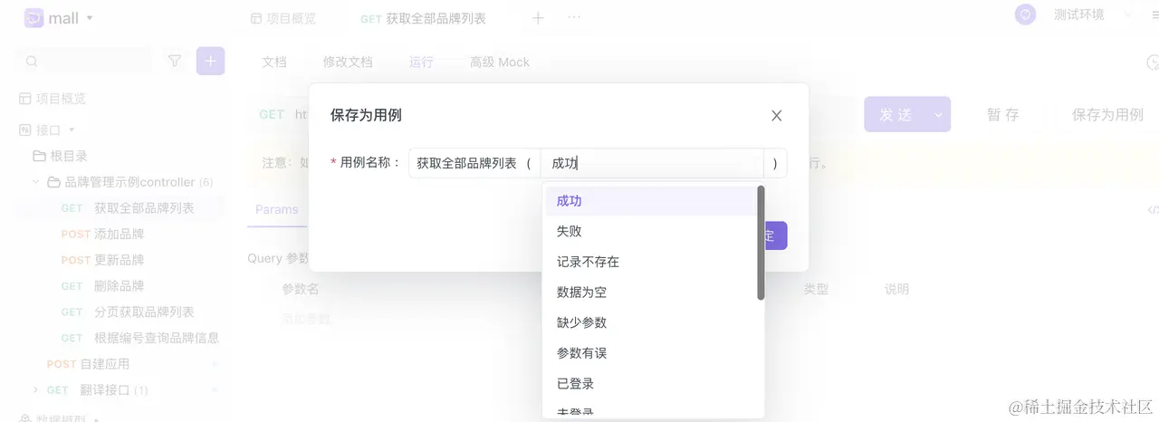测试同学也可以在 Apifox 对接口进行测试。每个接口文档可以快速生成多个不同状态(成功、失败)的测试用例。