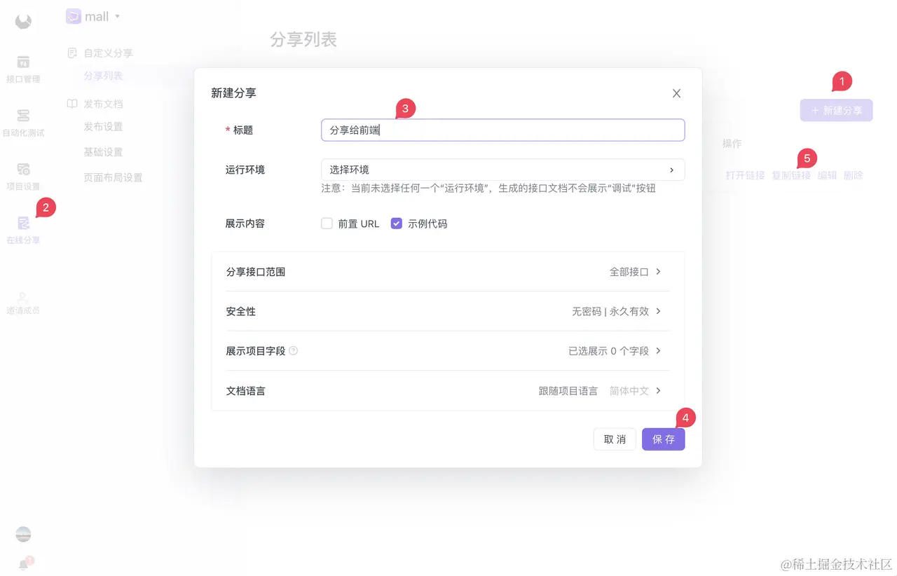 当你的文档同步到项目中,那么你就可以直接在 Apifox 中直接生成一个分享链接给别人,那么他看到的文档就都是最新的,不需要再管你索要接口文档文件。