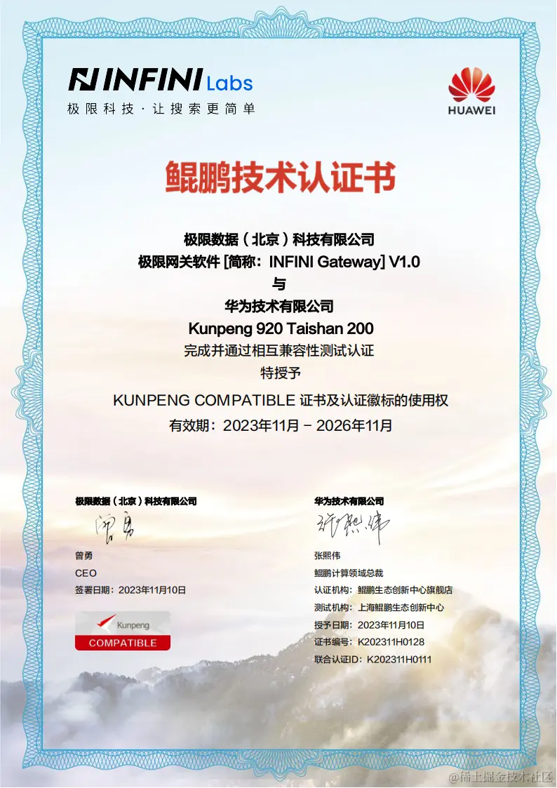 此次兼容适配基于 华为技术有限公司 Kunpeng 920 Taishan 200,在测试过程中,INFINI Gateway 展现出了良好的整体稳定性。经过对产品性能、兼容性、安全性和稳定性的测试,双方达到了预期目标,应用流畅、高效稳定,特授予 KUNPENG COMPATIBLE 证书,并授权使用认证徽标。