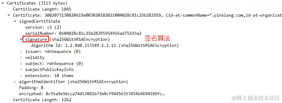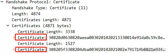 接着服务端给客户端发来了2个证书。第二个证书是第一个证书的签发机构(CA)的证书。