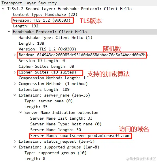 Client Hello里面客户端会告知服务端自己当前的一些信息,包括客户端要使用的TLS版本,支持的加密算法,要访问的域名,给服务端生成的一个随机数(Nonce)等。需要提前告知服务器想要访问的域名以便服务器发送相应的域名的证书过来。 -