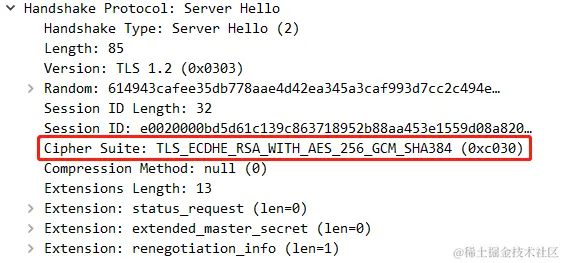 Server Hello,告诉客户端服务端选中的加密算法。 -