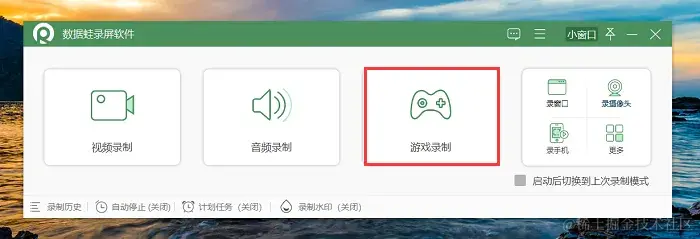步骤1:提前启动好需要录制的游戏,然后打开数据蛙录屏软件,在众多录制模式中,我们选择页面的 “游戏录制” 模式。