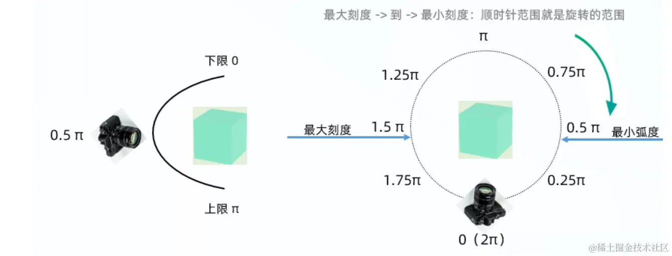 你能够水平旋转的角度下限。如果设置,其有效值范围为[-2 * Math.PI,2 * Math.PI],且旋转角度的上限和下限差值小于2 * Math.PI。默认值为无穷大。