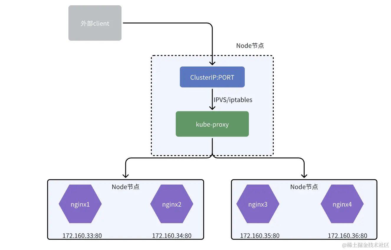 kube-proxy 通过监听知道了Service、endpoints对象的创建,然后把Service的CLUSTER-IP 和端口信息拿出来,创建iptables NAT规则做转发或通过ipvs模块创建VS服务器,这样经过CLUSTER-IP的流量都被转发到后端pod。