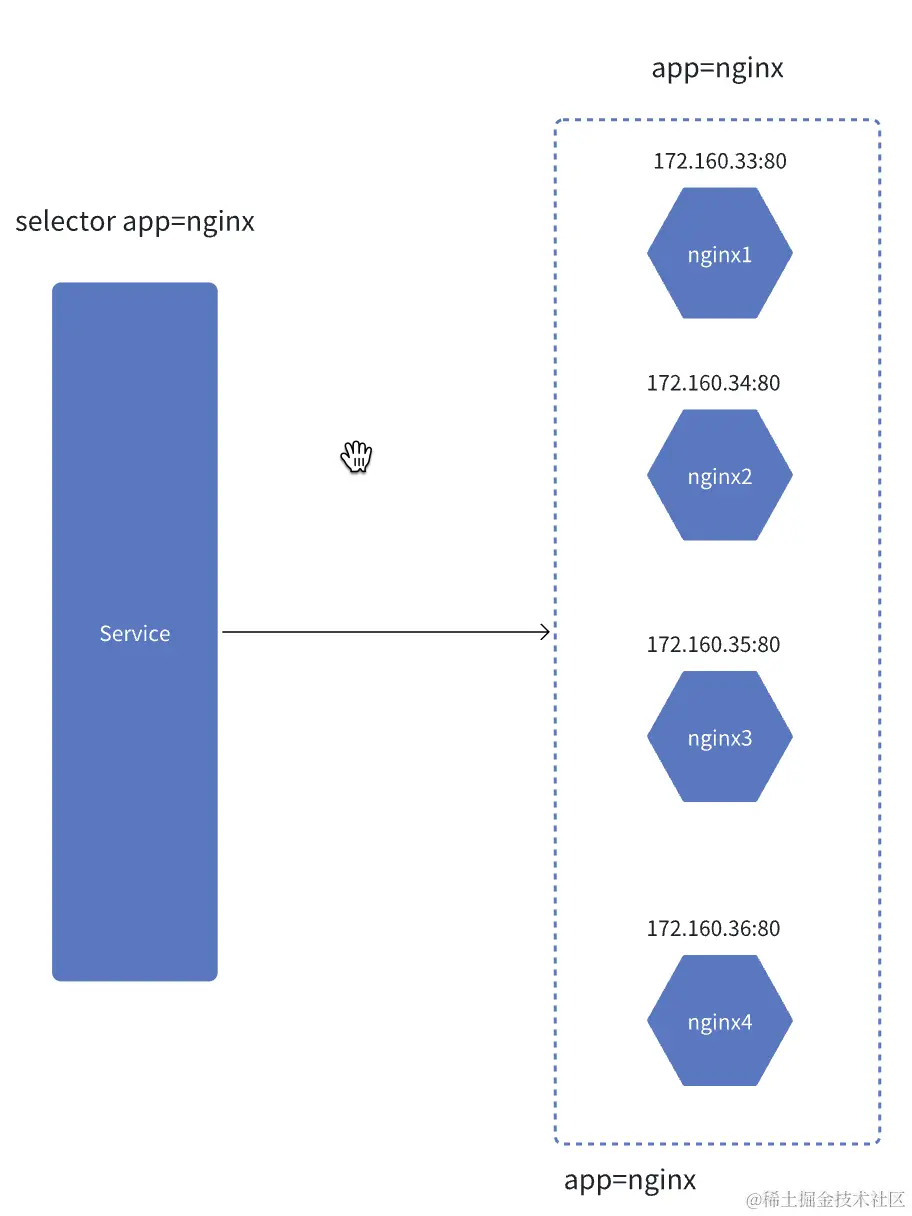 可以看到service 的selector属性指定了app: nginx,这样就能匹配 deplyment 中定义的 nginx pod