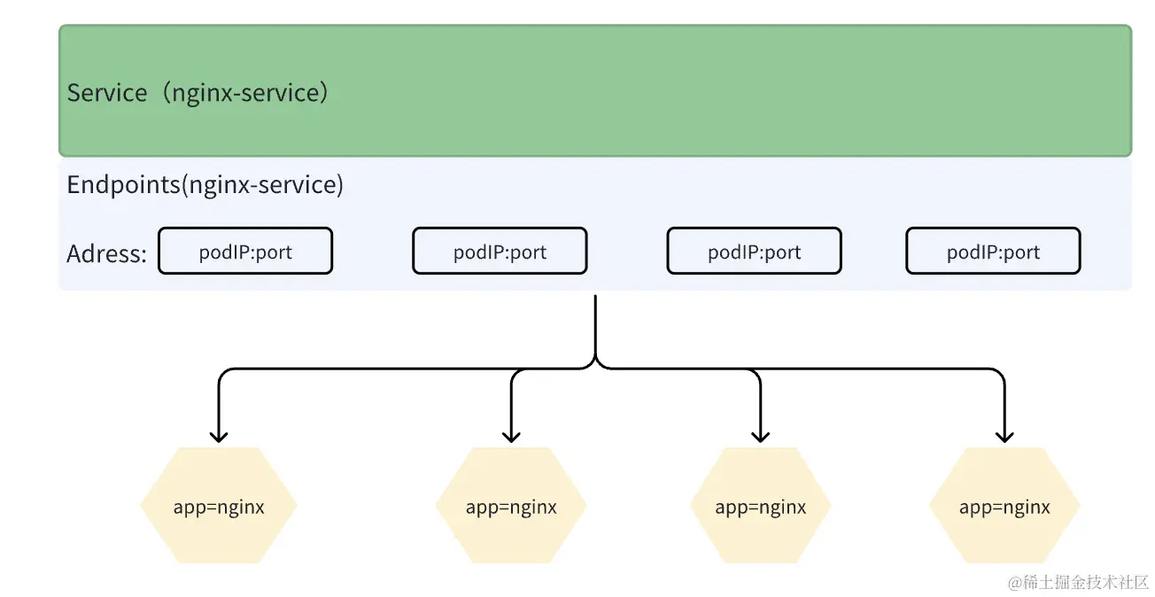 Pod 的地址管理则由Endpoints管理,根据Service名称可以查询Endpoints信息,当通过API创建/修改service对象时,endpoints控制器的监听到Service对象,然后根据Service的配置的选择器创建一个endpoints对象,此对象将pod的IP、容器端口信息存储到etcd中。