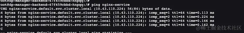 登录任意Pod,执行ping命令,可以看到根据Service 名称解析到了Service cluster ip