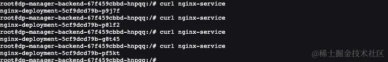 登录任意 pod,执行curl nginx-service,请求 service的 80 端口,会返回目标 pod名称