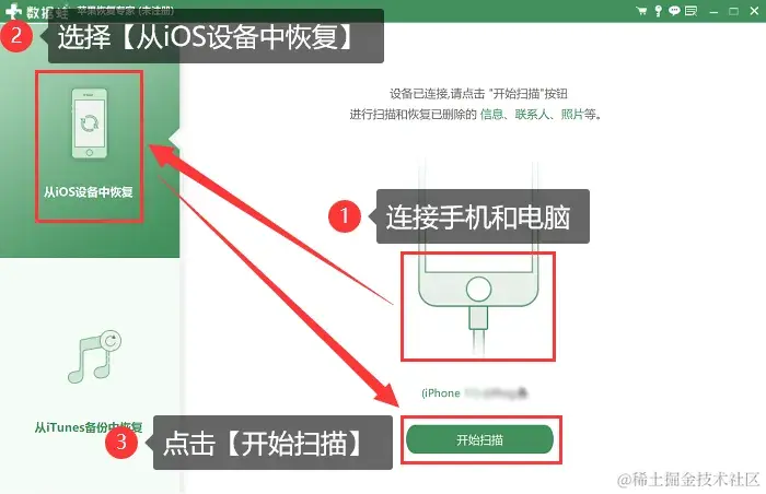 步骤2:连接之后选择【从iOS设备中恢复】,如果软件能够正常识别到iPhone手机,即可点击【开始扫描】按钮。如果检测不到,请检查电脑是否安装了iTunes软件。