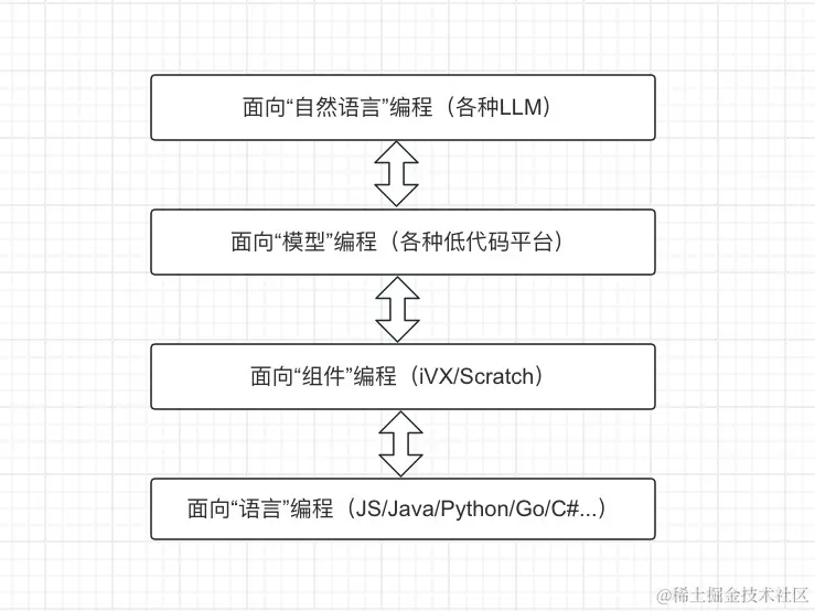 现在来看面向“组件编程”更加底层,更具备“编程语言”属性;而面向“模型编程”更容易操作,对用户要求也更低,甚至,可以在模型侧加入面向“自然语言”,那就完美了。所以我认为,理想的编程体系应该是这样的😝: