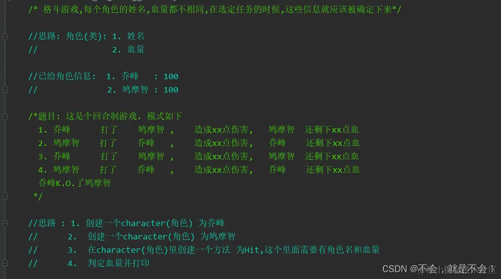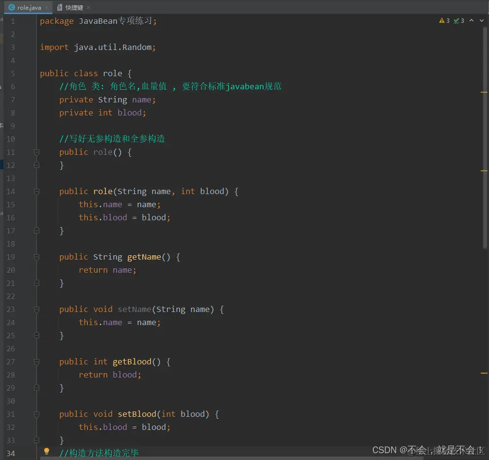 JavaBean文字格斗游戏(面向对象编程)的个人重写以及个人解释-CSDN博客 Zaccc 2023-11-28 47 阅读1分钟 题目和个人思路: 先写role类(对象)和构造方法(要按照标准的JavaBean来写) 根据题意,类中要有一个行为(方法)->攻击 开始进入main中, 首先当然是要创建两个对象,然后调用(攻击)attack方法 以上都是个人经过学习后重新又写的代码. 望各位指出不足.