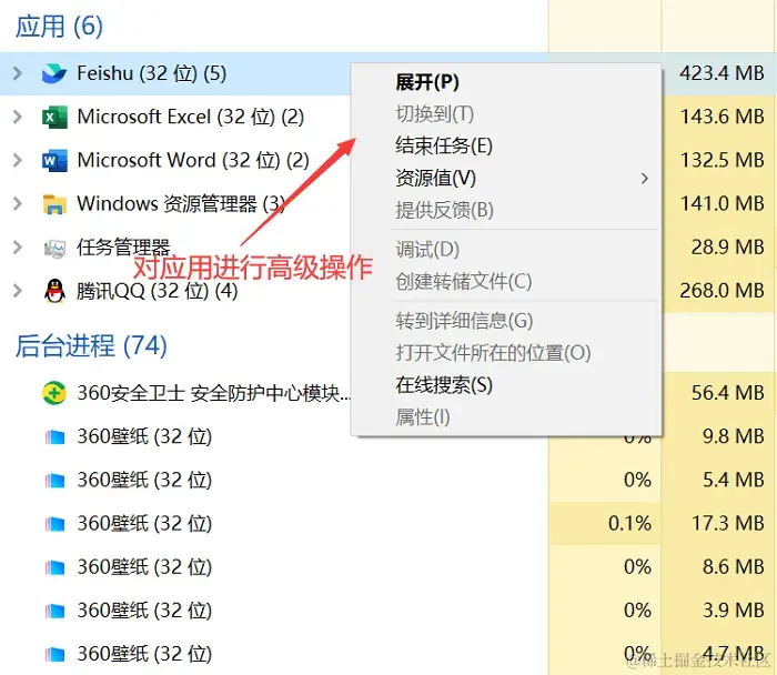 2.在任务管理器中,使用右键单击进程以进行高级操作,如打开文件位置、结束任务等。