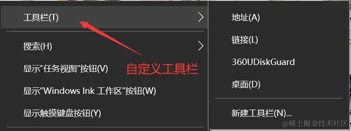 在任务栏上右键单击,选择 【工具栏】 可以添加一些有用的工具,如链接到文件夹或应用程序。
