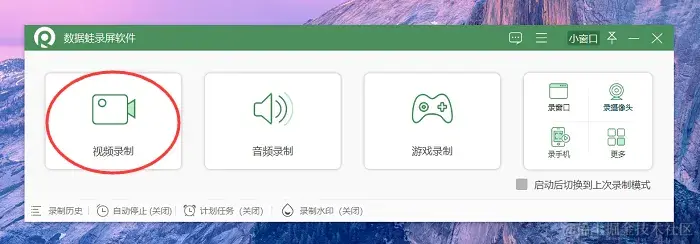步骤1:首先,从官网找到并安装数据蛙录屏软件,打开后您可以看见一个简洁的主页面,这里可以根据个人需求选择录制模式。