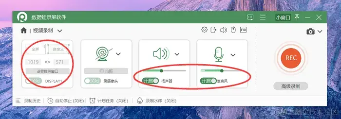 步骤2:以视频录制为例,在这里,用户可以选择全屏、自定义或固定区域进行录制,并对声音和音量进行调整。