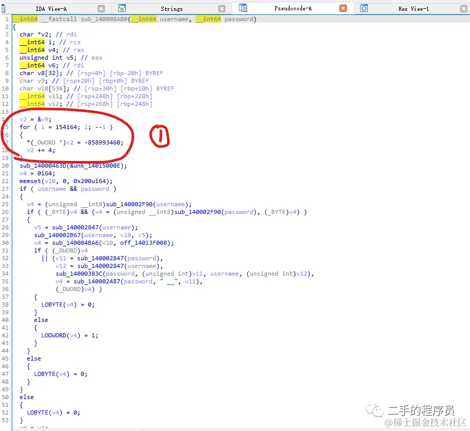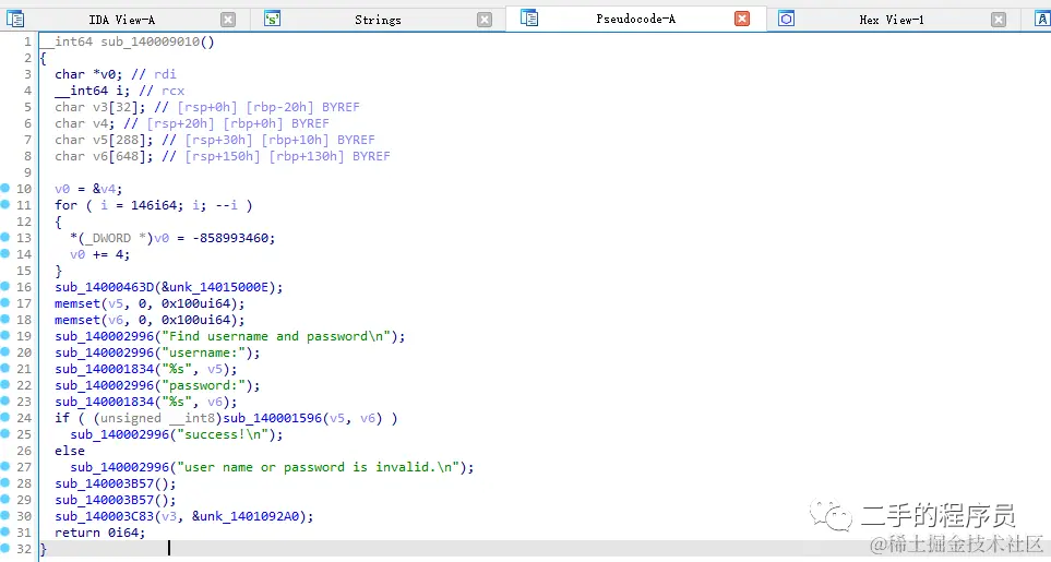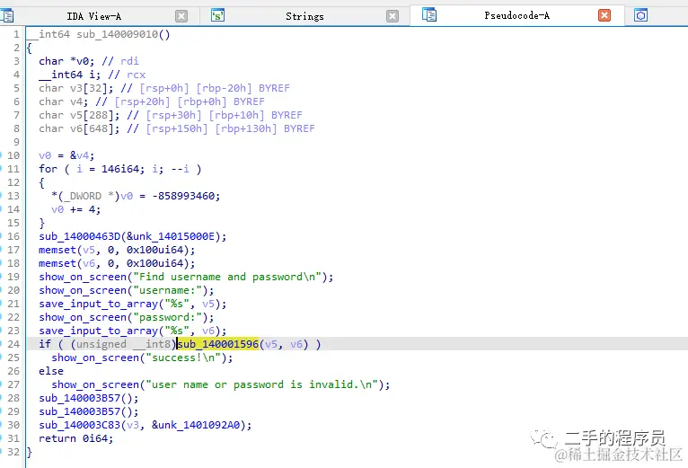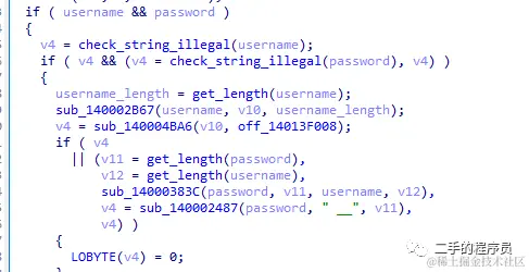 显然,最后的这个 sub_140001596 函数就是校验用户名与密码了。