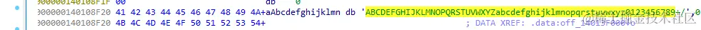 我们可以看到这个地方储存了一个地址,值为 0140108F20,这个地址里面储存的东西是 aAbcdefghijklmn,我们点一下这字符串(这个字符串是ida自动生成的,规则暂时不清楚,可以看作是真实字符串的一个缩影):