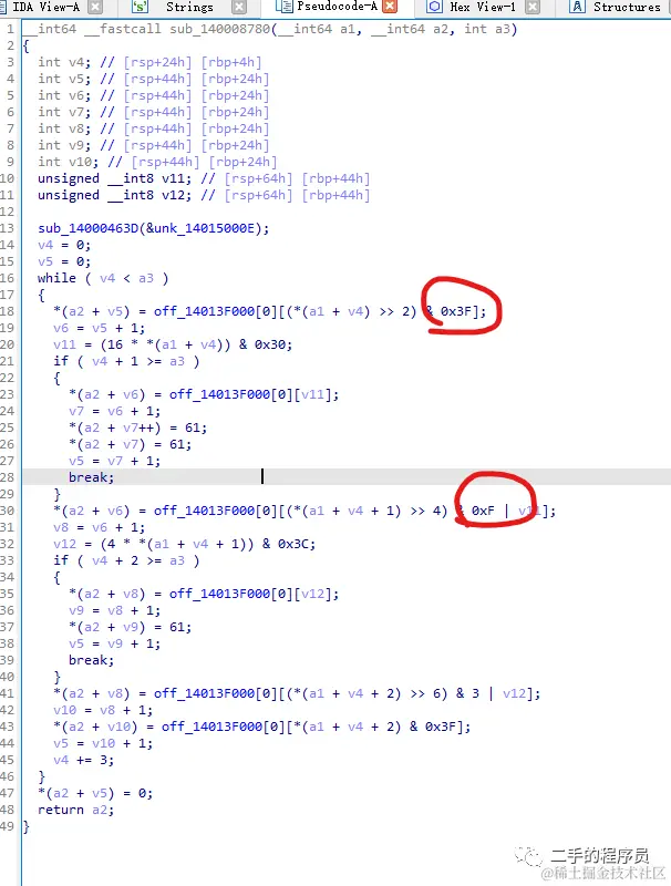 看起来就很复杂,但是有经验的人一眼就能看出这是一个 base64 编码算法,其特征就是里面的 0x3F,0xF 等数值。戳一下 off_14013F000: