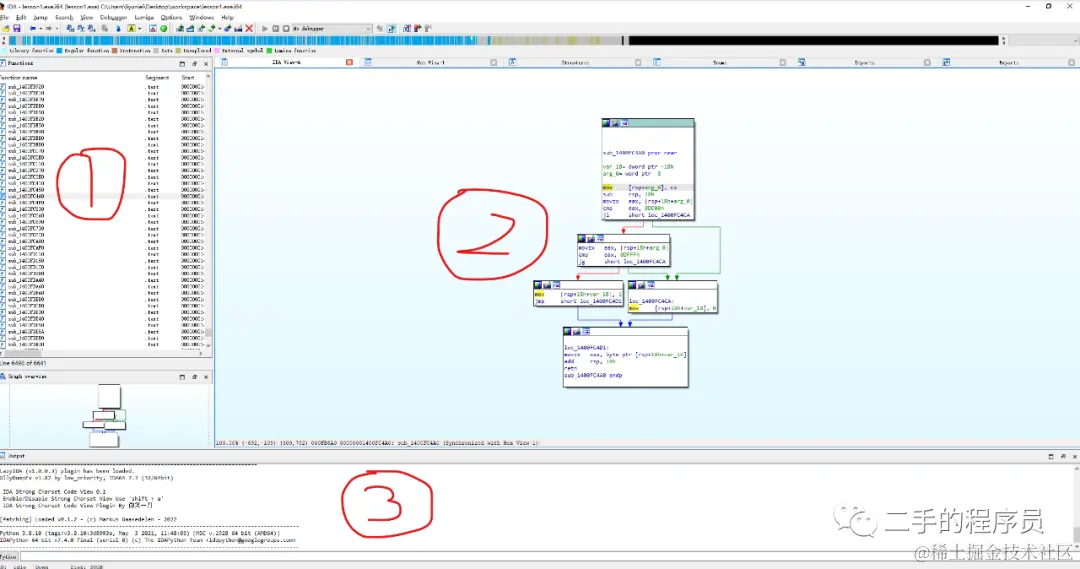第二部分是汇编代码窗口,注意上面的tab是 IDA viewA,还有很多其他的 tab 会显示在这块区域,我们后面都会涉及到。