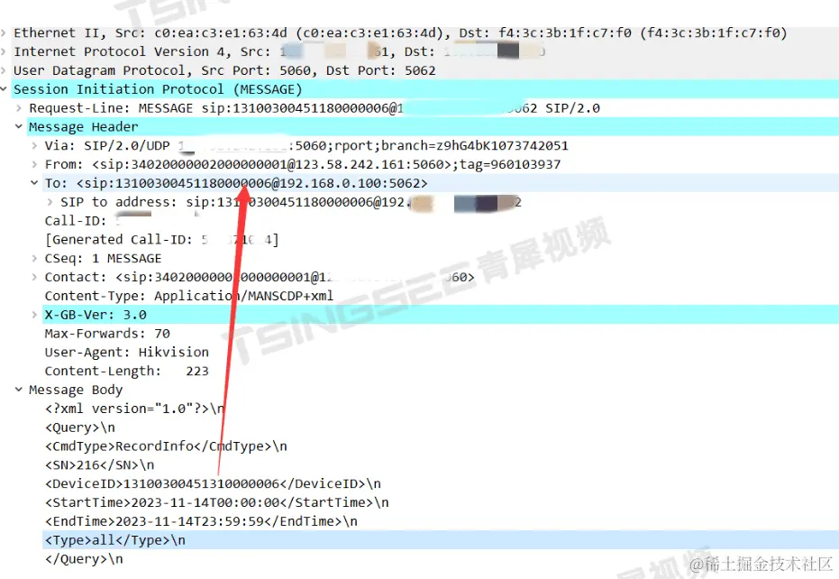 3、排查出原因是由于上级发送reconrdinfo信息to字段携带编码不正确从而导致下级未发送录像;