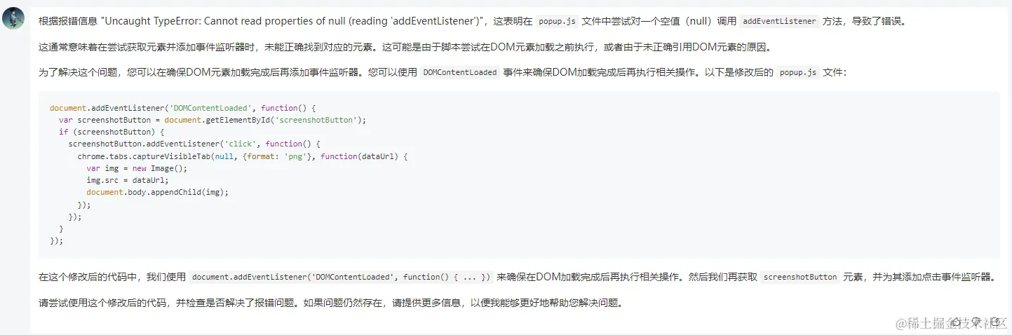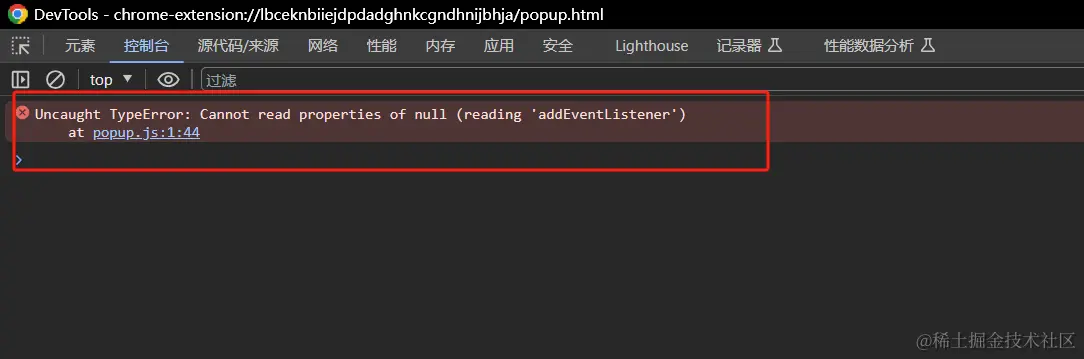 我发现控制台报错信息:Uncaught TypeError: Cannot read properties of null (reading 'addEventListener') at popup.js:1:44 请解决这个报错