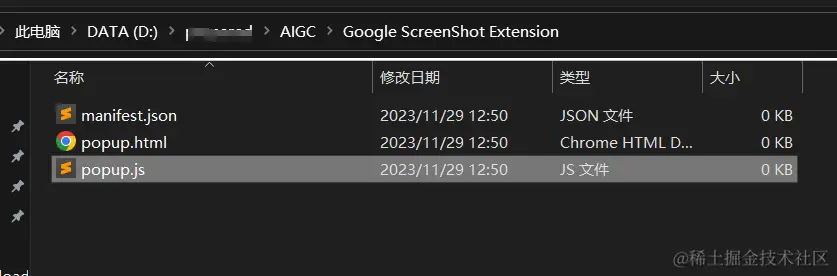 根据 GPT 返回,先创建一个 Google ScreenShot Extension 的文件夹,然后创建三个文件,分别是:manifest.json、popup.html、popup.js。