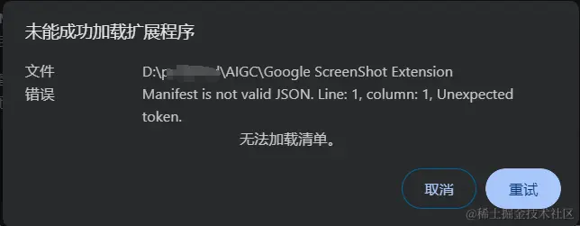 说 manifest.json 格式有问题,检查发现,我的文件根本没放内容(抽自己)。我们重新把 GPT 输出的内容放入 manifest.json 文件。