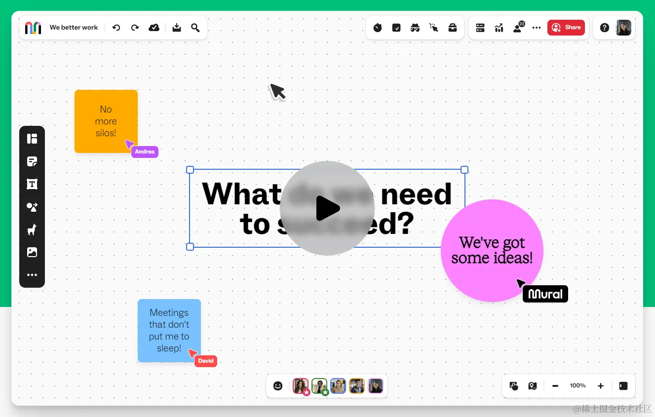 Mural是一款革命性的协作应用程序,包括无限和可调整大小的画布选项,让你选择适合合作目标的理想画布 - 灵活而无边界。你可以通过Noun Project、GIPHY和Unsplash集成以视觉方式表达你的想法,或者通过粘贴便条或文本框提出想法、行动项等,然后更改颜色并进行集群以揭示趋势或解决方案。