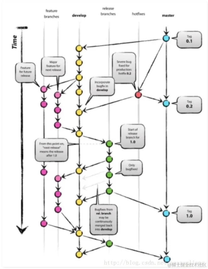 Gitflow工作流是经典模型,体现了工作流的经验和精髓。随着项目过程复杂化,会感受到这个工作流中深思熟虑和威力!
