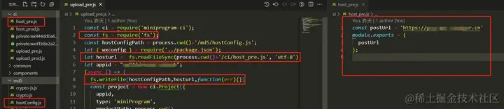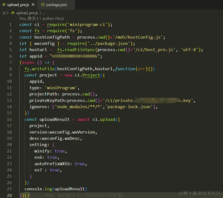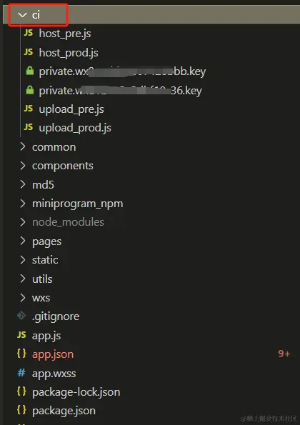 - 创建ci文件夹,将第一步下载的密钥放到文件夹,并新建“上传配置”文件(我取名叫upload_pre.js),项目目录如下(开头说过是两个appid,所以我有两个密钥)