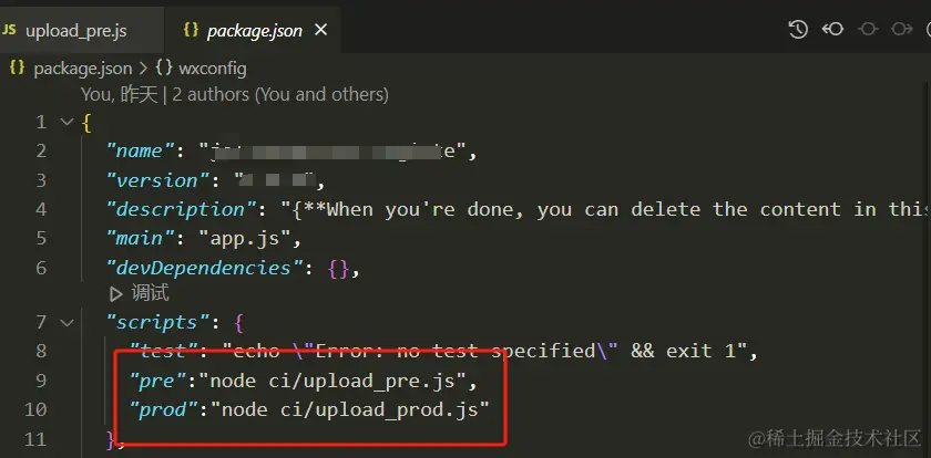 使用上面的脚本已经可以上传代码了,但是我们没有去修改version和desc(这两个对应开发工具上传时的版本和描述)。我是将它写在package.json文件,然后upload_pre.js获取