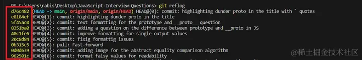 如果你想知道如何检索一个提交哈希,使用git reflog很简单。在下面的屏幕截图中,突出显示的部分表示您可以轻松复制的提交哈希: