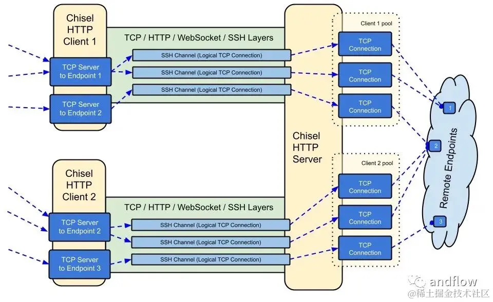 Chisel是一个用Golang开发的开源网络隧道解决方案。它支持TCP、HTTP和WebSockets等多种协议。Chisel提供了一个简单的命令行界面,开发人员很容易入手。它还支持与客户端自动重新连接,确保稳定运行。