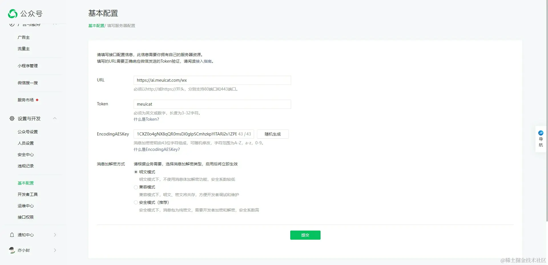 服务器配置处修改配置,依次填写URL、Token、EncodingAESKey,消息加解密方式选择明文,提交即可。