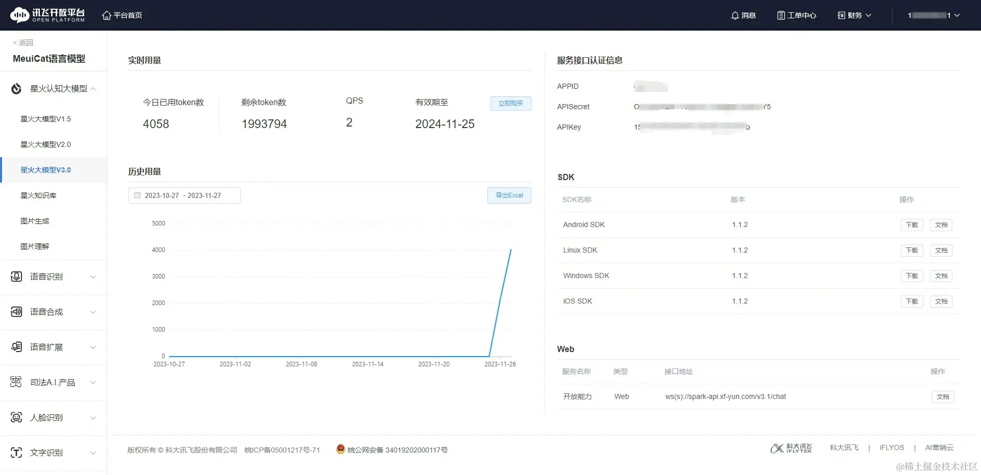 星火大模型V3.0处进行点击立刻购买,选择个人认证的免费保进行下单。回到页面后,记下APPID、APISecret、APIKey的值,后面需要用到。(注意这些内容不可重置,所以勿轻易泄露。)