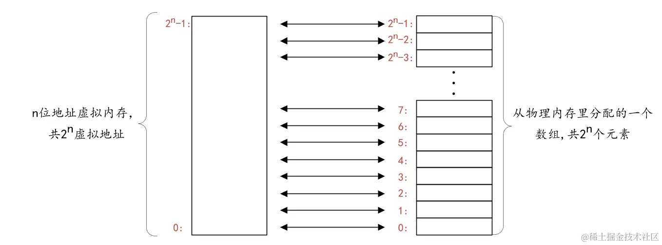 16位二进制数总共可以表示2^16=65536个虚拟地址,操作系统可以在物理内存中创建一个数组,该数组中包含65536个元素,让虚拟地址的值和数组下标一一对应,这个数组元素的值代表该虚拟地址映射到的物理地址。那么如果CPU支持n位虚拟地址,那么操作系统就得为每个进程维护一个包含n个元素的数组,如下图所示: