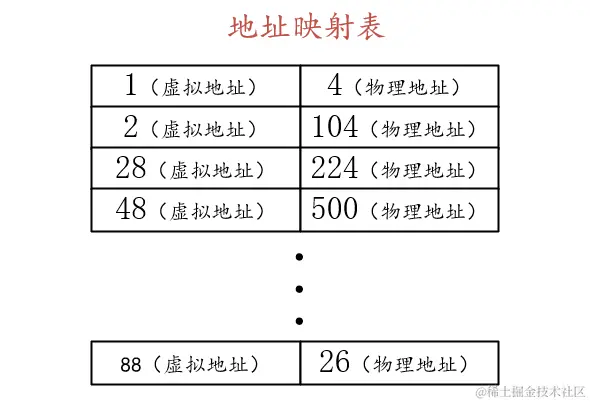 操作系统可以专门从物理内存中拿出一块区域作为地址映射表,映射表的一个表项用于说明一个虚拟地址和一个物理地址之间的映射关系,比方说下边这个地址映射表: