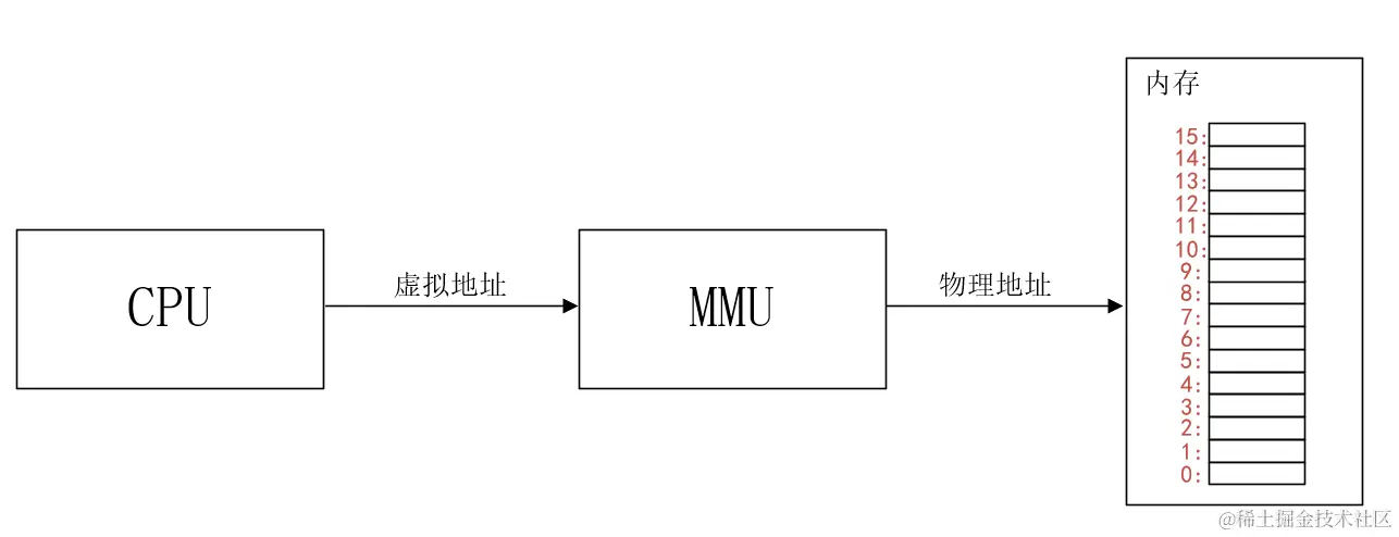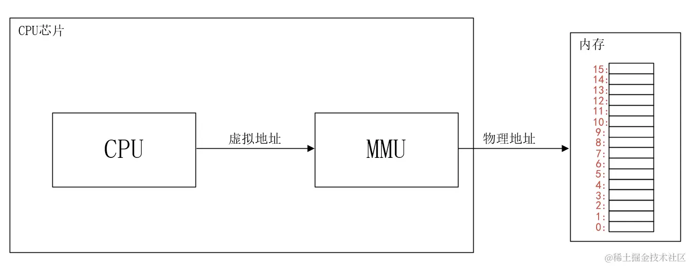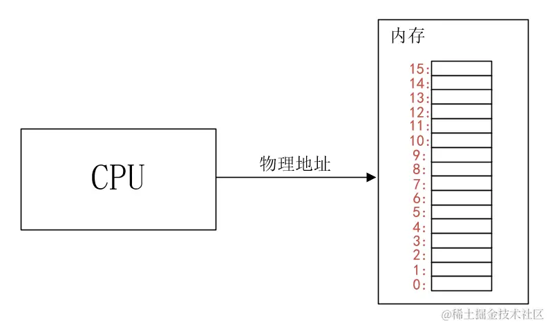 原先CPU在执行指令时,将指令用到的内存地址会直接发送给内存,如下图所示: